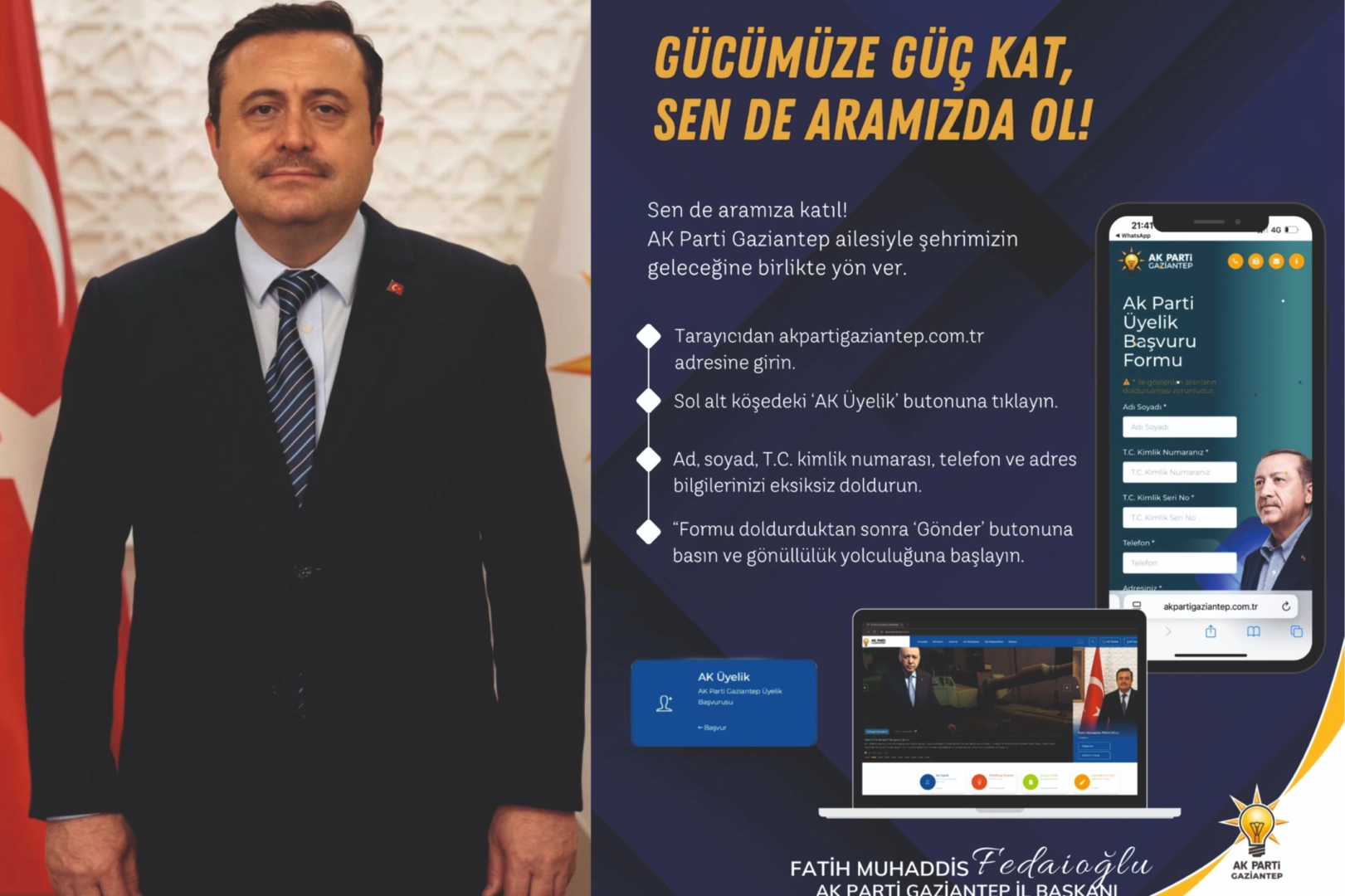 AK Parti Gaziantep İl Başkanı Fatih Muhaddis Fedaioğlu, dijital üyelik uygulamasına ilişkin yaptığı açıklamada, “Cumhurbaşkanımız Sayın Recep Tayyip Erdoğan’ın liderliğinde Türkiye Yüzyılı’na emin adımlarla ilerlerken, partimizin dijital dönüşümünü de aynı vizyonla güçlendiriyoruz. AK Parti’ye katılmak artık birkaç dakikalık bir işlemle, cep telefonu ya da bilgisayar üzerinden kolayca yapılabiliyor. Bu adım, teşkilatımızın çağın gereklerine uygun biçimde yenilenme kararlılığının en somut göstergesidir. Gaziantep, her alanda öncü kimliğiyle olduğu gibi dijitalleşme sürecinde de örnek bir şehir olmuştur. Partimize gönül veren herkesi, bu yeni sistem üzerinden AK Parti ailemize katılmaya davet ediyorum. Birlikte daha güçlü, daha büyük bir Türkiye için çalışmaya devam edeceğiz” ifadelerini kullandı.