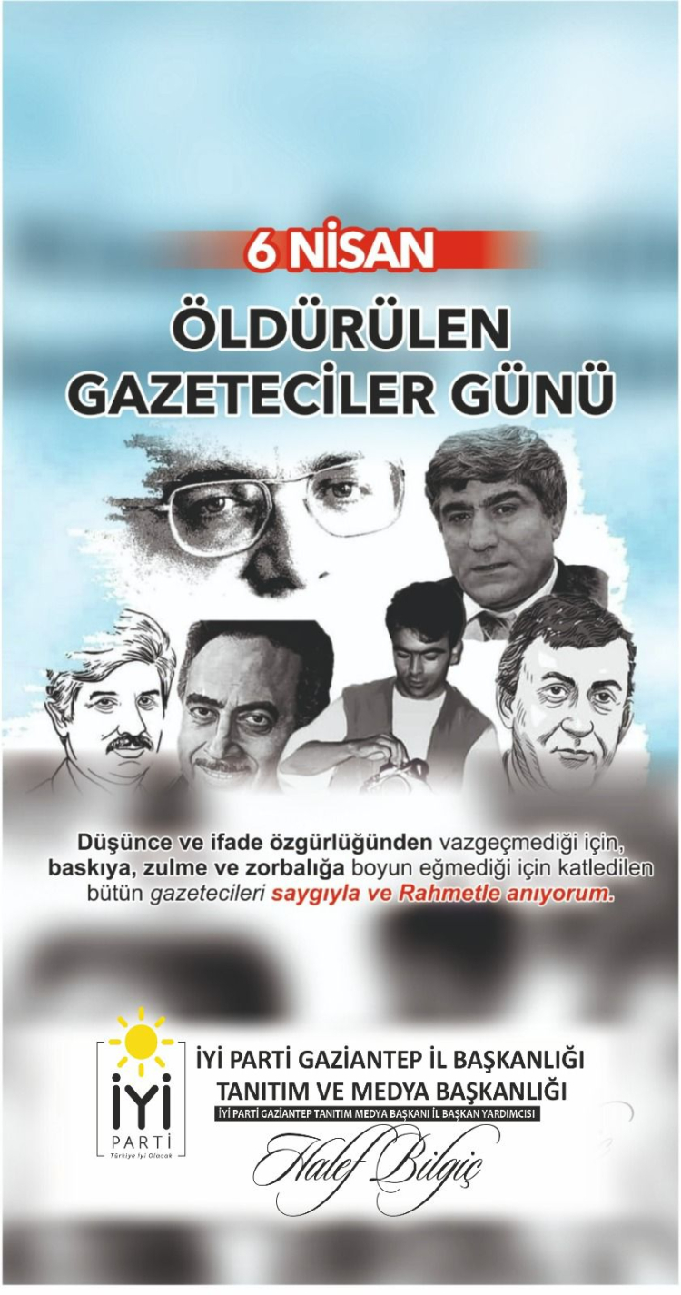 İYİ Parti Gaziantep İl Başkanlığı Tanıtım ve Medya Başkanlığı, 6 Nisan “Öldürülen Gazeteciler Günü” dolayısıyla anlamlı bir mesaj yayımladı.